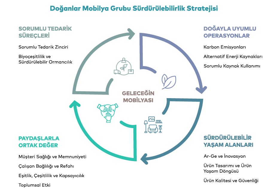 “Geleceğin Mobilyası” vizyonumuzun temelinde doğaya ve insana olan sorumluluğumuz yatıyor. Bu bağlamda; tedarik zincirinden üretim süreçlerine, ürün tasarımından paydaş ilişkilerine kadar tüm iş süreçlerimizi sürdürülebilirlik ilkeleri doğrultusunda yönetiyoruz. Her adımda çalışanlarımızdan aldığımız güçle ve etik ilkelere bağlı kalarak geleceğe uzanan mobilyalar üretme amacıyla hareket ediyoruz.